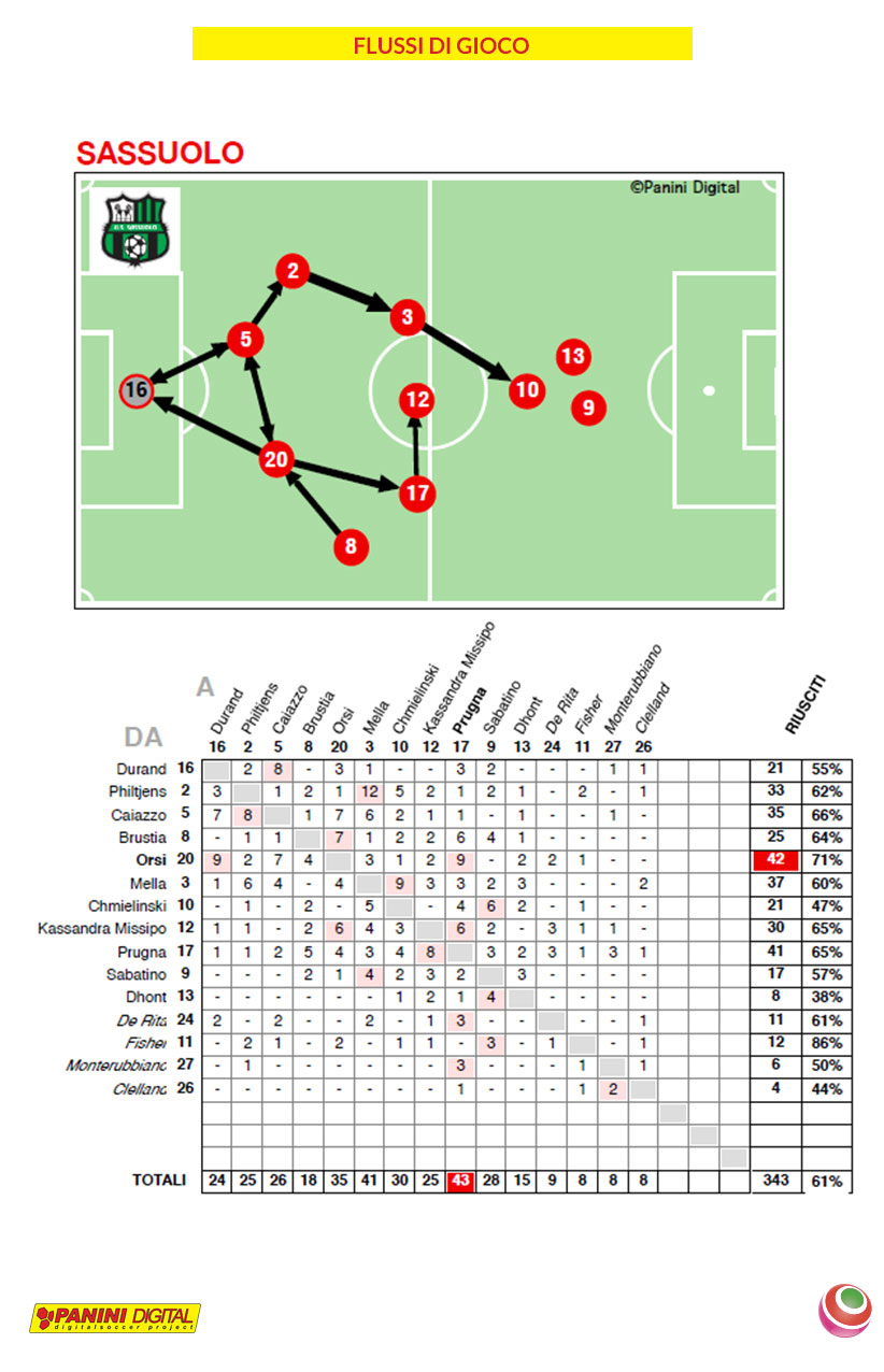 Le neroverdi hanno avuto più possesso palla, dove il pallone l’hanno tenuto per 27′:32″ e il 54%, mentre le blucerchiate l’hanno giocato 23′:31″ e il 46%. Sassuolo avanti nel numero di giocate utili: 110 a 67.