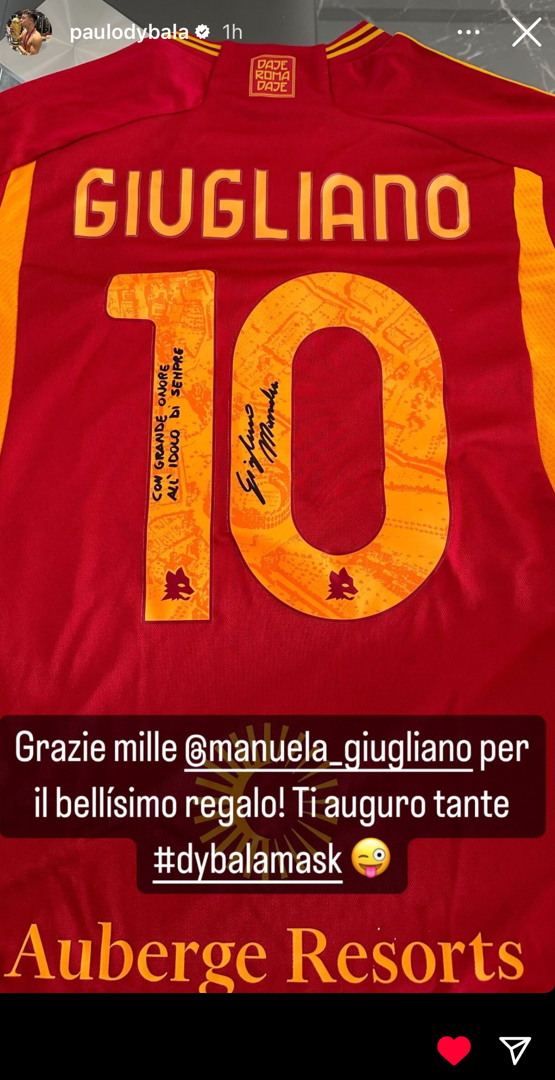 “Con grande onore all’idolo di sempre”. Manuela Giugliano, con questa dedica, ha regalato la sua maglia autografata a Paulo Dybala. La risposta social dell’argentino è stata:”Grazie mille per il bellissimo regalo! Ti auguro tante Dybala mask”.