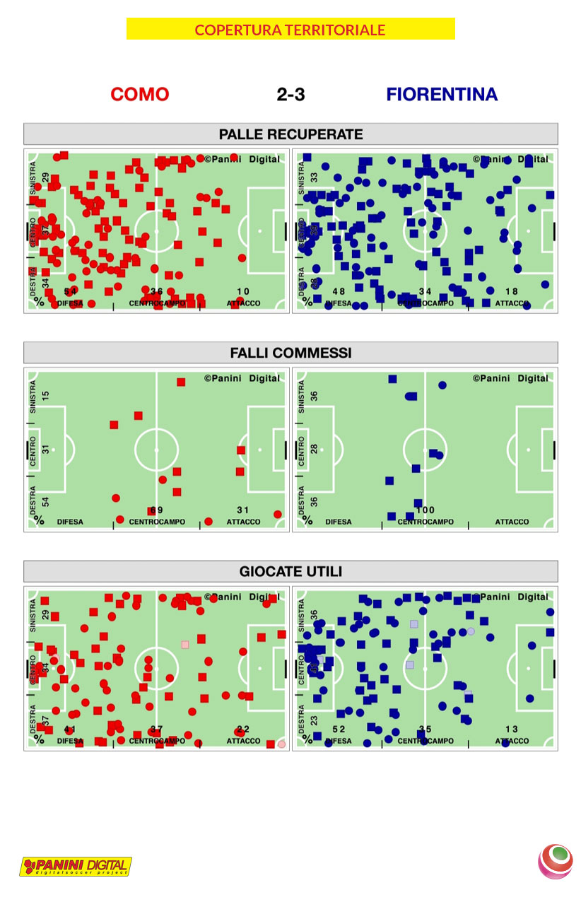 Sulla supremazia territoriale, però, è il Como ad avere leggermente la meglio, a fronte sia di un baricentro di 5 metri più alto, sia di un secondo tempo maggiormente proiettato in avanti che ha aggiunto 5 minuti e mezzo di possesso nella metà campo avversaria ai quasi 4 minuti fatti registrare nel primo, contro gli 8 minuti e 39 secondi della Fiorentina che li ha distribuiti equamente tra prima e seconda frazione.