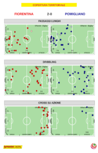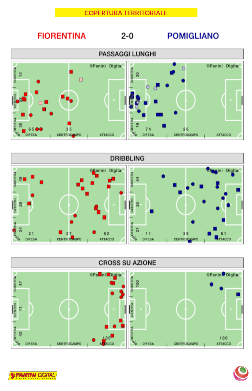 Questa “apertura” tattica ha comportato, su alcuni dati, risultati migliori e numeri statistici più alti nella seconda frazione rispetto alla prima: riscontriamo questo, da parte viola, nel possesso palla che risulta 4 punti percentuali più alto, nei palloni giocati in zona area che sono 13 in più, nel tempo di supremazia territoriale superiore di 1 minuto e 19 secondi e negli 11 passaggi bassi utili in più realizzati nella metà campo avversaria. La formazione guidata da Sanchez ha espresso un’inferiore qualità di gioco, totalizzando 244 passaggi riusciti contro i 462 delle padrone di casa e circa metà delle giocate utili fatte registrare dalla squadra di Panico: di conseguenza nemmeno sul piano offensivo le statistiche premiano il Pomigliano, capace di giocare 42 palloni nei pressi dell’area di rigore avversaria e di calciare 8 volte verso la porta protetta da Katja Schroffenegger, la metà delle quali nello specchio.