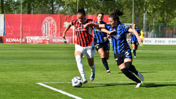 Dopo i primi 5 minuti equilibrati e di studio accelera immediatamente il Biscione che in pochi istanti si rende pericoloso per due volte, trovando la rete del vantaggio all’8′ con Marija Milinkovic che è abile a trasformare in rete un pallone vagante in area dopo un miracolo di Noemi Fedele sul colpo di testa Elisa Polli; ancora a segno il centrale difensivo bosniaco classe 2004 dopo il gol dell’andata. Dopo la fiammata nerazzurra fatica a prendere ritmo il match: il Milan tiene più il controllo del gioco ma non riesce a creare reali occasioni da rete mentre le ospiti attendono basse e compatte aspettando il momento adatto per colpire in ripartenza. La svolta avviene al 24′ quando Chantè Dompig riceve sulla sinistra e si accentra prima di rilasciare il destro verso la porta che viene deviato dalle braccia di Beatrice Merlo: dal dischetto va la stessa Dompig che trasforma il calcio di rigore spiazzando Cecilia Runarsdottir per il pareggio del Diavolo. Torna a ripresentarsi in avanti l’Inter al 35′ quando Irene Santi tenta il jolly da fuori area con la sua conclusione che sibila la traversa a Fedele battuta; sul corner successivo una girata in area piccola di Polli si alza troppo e strozza in gola l’urlo dei tifosi interisti. Gli ultimi minuti della prima frazione si assestano su un sostanziale equilibrio con poche fiammate da una parte e dall’altra che, però, non rompono la parità. Il parziale al termine dei primi 45 minuti è dunque 1-1, risultato corretto per ciò che si è visto in campo.