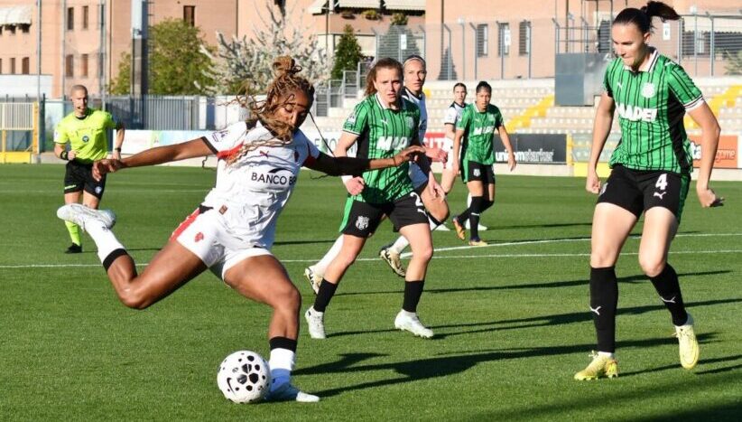 Il Milan parte meglio e nei primi 5′ colleziona subito due corner mentre al 7′ Grimshaw, servita da Mascarello, chiama in causa Benz, che ci mette i pugni su un destro da fuori area. La stessa rossonera ci riprova al 13′ ma la conclusione si spegne lontano dai pali neroverdi. Al 16′, invece, è Soffia a cercare fortuna di testa, su angolo di Mascarello, con sfera che termina sopra la traversa.