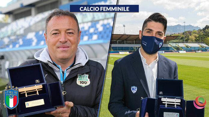 Una giornata intensa, vissuta tra San Marino e Reggio Emilia, per continuare nel proprio ‘tour’ in giro per la penisola italiana, per consegnare agli allenatori vincitori i riconoscimenti conquistati per essere stati votati dai propri colleghi quali migliori allenatori della scorsa stagione nelle rispettive categorie. Nella giornata di sabato il presidente del Settore Tecnico, Demetrio Albertini – dopo essere stato a Zingonia per premiare Gasperini e a Benevento per omaggiare Filippo Inzaghi – ha virato sull’Emilia Romagna e su San Marino, per celebrare i migliori allenatori del calcio femminile della scorsa stagione: nelle votazioni avvenute on-line nelle scorse settimane, infatti, i migliori tecnici della Serie A TIMVISION e della Serie B femminile sono risultati essere Gianpiero Piovani del Sassuolo e Alain Conte, tecnico che ha condotto la San Marino Academy alla promozione nel massimo campionato nazionale. Così Albertini si è recato personalmente, prima al San Marino Stadium, cornice dell’allenamento delle Titane, per consegnare la Panchina d’argento al tecnico Alain Conte, quindi allo stadio Città del Tricolore di Reggio Emilia, prima di Sassuolo-Fiorentina (maschile), per consegnare la Panchina d’oro all’allenatore neroverde Gianpiero Piovani.
