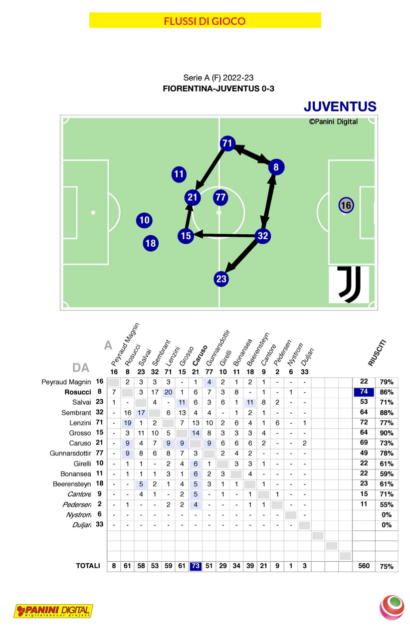 Una gara che valeva per lo scontro diretto alla seconda posizione, per il temporaneo primato ad una sola giornata dalla conclusione della “top five”, ha segnato la pericolosità della Juventus , in fase “offensiva”, con 14 su 26 tiri verso la porta difesa da Rachele Baldi; mentre per le padrone di casa si è scritta una sola vera occasione da rete, bloccata facilmente da Pauline Peyraud Magnin, dei 9 tiri verso la porta ospite. La gara, orchestrata dalle Piemontesi, ha visto tantissime iniziative personali con ricerca della profondità ( 300 passaggi bassi utili nella metà campo avversaria, contro i soli 134 delle padrone di casa) con l’utilizzo dell’ampiezza, in una % di cross su azione da destra, che sfiora il 64% (contro il 36.8 della zona sinistra). Tutto questo a visto fraseggiare Arianna Caruso e Martina Rosucci (le migliori in campo per dinamicità e numero di passaggi riusciti con le compagne di gioco) in un flusso di gioco creato sempre dal centro campo. La continua ricerca di Rosucci, per i piedi di Lenzini, ed Caruso per Grosso hanno creato delle aperture da sinistra verso destra che hanno portato al tiro 20 volte nell’arco dei novanta minuti.