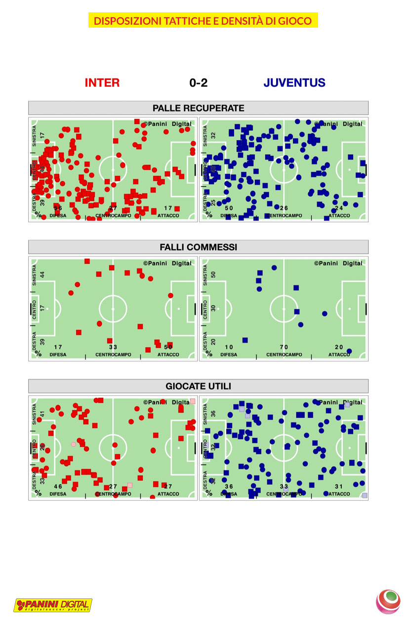 L’Inter della ripresa evidenzia un calo fisico e mentale con più palle perse che recuperate (29 contro 20) con un grande lavoro di Van der Gragt (sue le 29 palle recuperate) ma troppi errori per Karchouni (20 palloni persi) nonostante l’attaccante porta ben 3 tiri verso la porta della Juventus.