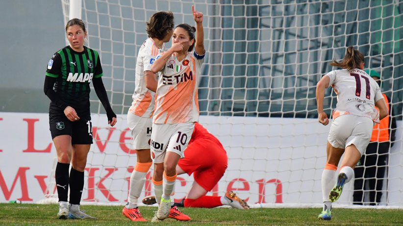 Gara che vede le padrone di casa aggredire con caparbietà fin dai primi minuti: sugli sviluppi di un calcio d’angolo con Chmielinski, palla in area respinta con i pugni da Ceasar, ed allontanato da Haavi, arriva Prugna che con il destro di prima intenzione da oltre 20 metri mette il pallone nell’angolino alto, dove il portiere giallorosso non può arrivare, per il vantaggio Sassuolo. La Roma tenta la reazione ma le neroverdi sono ben disposte in campo e riescono a bloccare gli affondi di Haavi. Le ragazze di Rossi, sulla scia della buona gara con la capolista, rallenta il gioco e non offre alle giallorosse di portare palla. Al 34′ su di un fallo di Prugna su Giacinti, giudicato dal direttore di gara come volontario, viene decretato il rigore: dal dischetto va Giugliano che spiazza Durand per la parità. Nonostante una buona gestione del gioco da parte delle Campionesse d’Italia in carica, con ben 4 tiri a rete (contro soltanto 1 del Sassuolo: quello del gol), il punteggio della prima frazione resta sul 1 a 1.