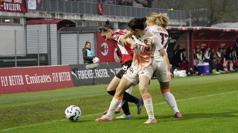 Il Milan approccia il match gestendo bene il pallone e rendendosi pericoloso subito in avvio con il tiro di Kyvåg, seguita da Arrigoni e van Dooren: la difesa giallorossa riesce però a mettere una pezza in tutti e tre i casi. L’affanno si trasforma presto in un respiro di sollievo: le giallorosse salgono e cominciano a creare, il passare dei minuti diventa il loro alleato nella costruzione. Pilgrim, Rieke e Haavi nell’ordine sfiorano il vantaggio, murate dalle rossonere, ben piazzate in area e pronte a qualsiasi imprevisto. Bene le ragazze di Rossettini, in un crescendo costante che aumenta il fraseggio e non lo limita alla sola ripartenza.