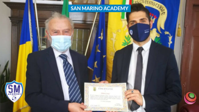 Riconoscimento al merito sportivo cervese per mister Alain Conte, ricevuto dal sindaco di Cervia Massimo Medri che si è complimentato per gli importanti traguardi raggiunti alla guida della #SanMarinoAcademy, tenendo alto il nome del comune romagnolo nel mondo dello sport, come dimostra anche la recente assegnazione della Panchina d’Argento al tecnico dell’Academy.