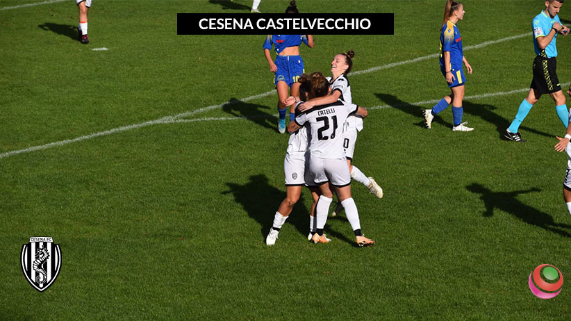 È il Cavalluccio che sin dai primi minuti gestisce il gioco e fa maggior possesso palla, ma la prima potenziale occasione capita alla squadra di casa al 18′: Uzqueda ruba palla e calcia, non trattiene Serafino che è brava però a rialzarsi subito e a recuperare la sfera. Il primo tiro nello specchio per le bianconere arriva al 21′: Catelli apre sull’esterno per Lonati che entra in area palla al piede, la numero 9 prova a calciare ma il tiro viene smorzato dalla difesa e arriva comodo tra le braccia di Sattolo. Due minuti più tardi super occasione per passare in vantaggio: Risina sulla fascia, con un tocco di esterno, mette al centro per Sechi che colpisce a botta sicura, il tiro è centrale e il portiere para. Alla mezz’ora ancora Risina che passa a Milan: la numero 20 si accentra e prova il tiro a giro che finisce alto. Passano appena tre minuti e il Cesena ha un’ulteriore occasione per trovare il vantaggio: Lonati batte veloce una rimessa laterale e serve Sechi in area, la numero 27 salta due difensori, calcia sul primo palo ma il pallone viene deviato in angolo. Il meritato gol arriva al 39′: pressione del Cesena che prima colpisce la traversa con Tamborini, il pallone rimane vivo e arriva sui piedi di Catelli che di sinistro calcia dalla distanza trovando la sua prima rete in bianconero.