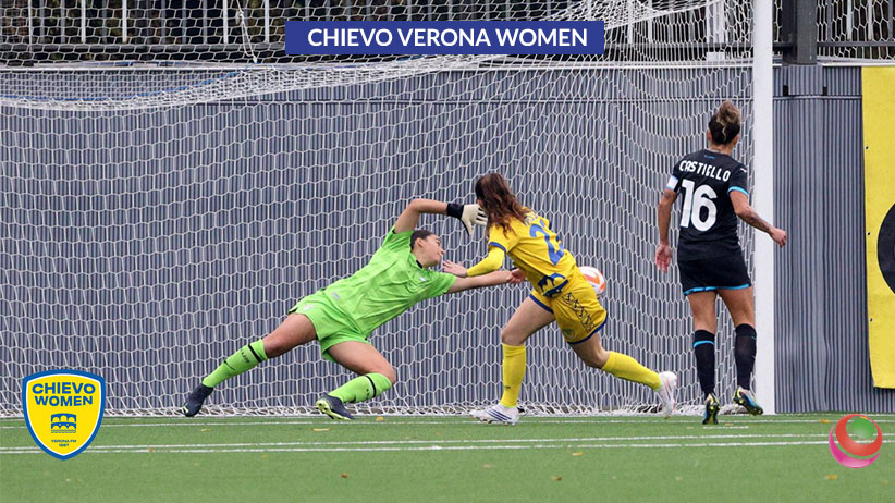 Palo gialloblù! – Inizio tambureggiante quello del Chievo, che al 4′ costruisce una clamorosa occasione per trovare il vantaggio. Ferrato strappa un bel pallone in area e serve Massa, bravissima a preparare lo spazio per la conclusione in mezzo a due maglie laziali e cercare l’angolino, ma un gran riflesso di Guidi spinge la sfera sul palo.