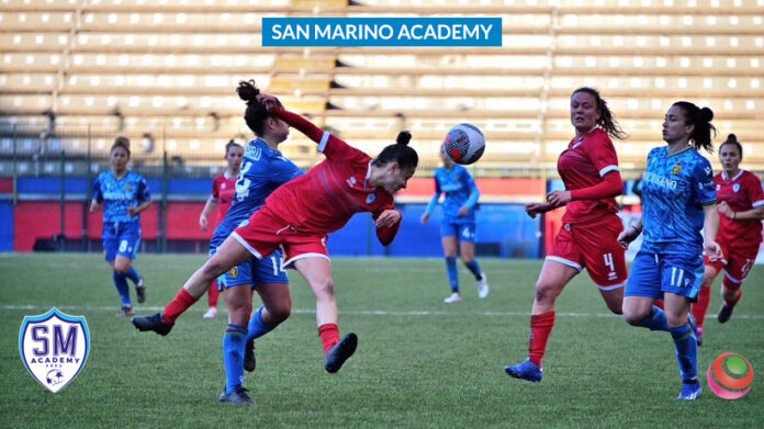 La vittoria era praticamente un obbligo e vittoria è stata. La San Marino Academy supera il fanalino Ravenna segnando per la prima volta in stagione tre gol e portandosi per il momento a +2 dalla terzultima posizione, in coabitazione con la Res Roma. Tre novità nell’undici di mister Venturi rispetto alla gara con l’Arezzo. Brambilla, pienamente recuperata dopo l’infortunio, torna al centro del centrocampo a cinque. Nella stessa linea si rivede anche Giuliani, mentre dietro, come “braccetto” destro, spazio a Manzetti. Le Titane partono alla carica, costruendo la prima chance al 5’: punizione di Giuliani per la testa di Barbieri che, lasciata sola, chiama Pignagnoli ad una parata non banale. Tamburini inizia a mettere seriamente in difficoltà la retroguardia di casa con i suoi attacchi alla profondità. Dopo un tentativo che non va a buon fine, al 9’ la giocata riesce: Brambilla lancia la 22, che scappa alle spalle della difesa, aggira l’uscita di Pignagnoli e appoggia in rete il pallone del vantaggio e della terza marcatura personale in stagione. Academy di nuovo pericolosa al 13’: apertura di Barbieri per Ladu, che si inserisce coi tempi giusti e poi mette un cross sporcato dalla testa di Diversi. La palla schizza nella zona di Barbieri, che se la sposta sul mancino e calcia alto, ma non di molto. La parte centrale della frazione scorre via con una certa gestione da parte della San Marino Academy, che rischia il minimo ma non trova grandi combinazioni per arrivare dalle parti di Pignagnoli. Ne derivano poche emozioni su ambo i fronti.