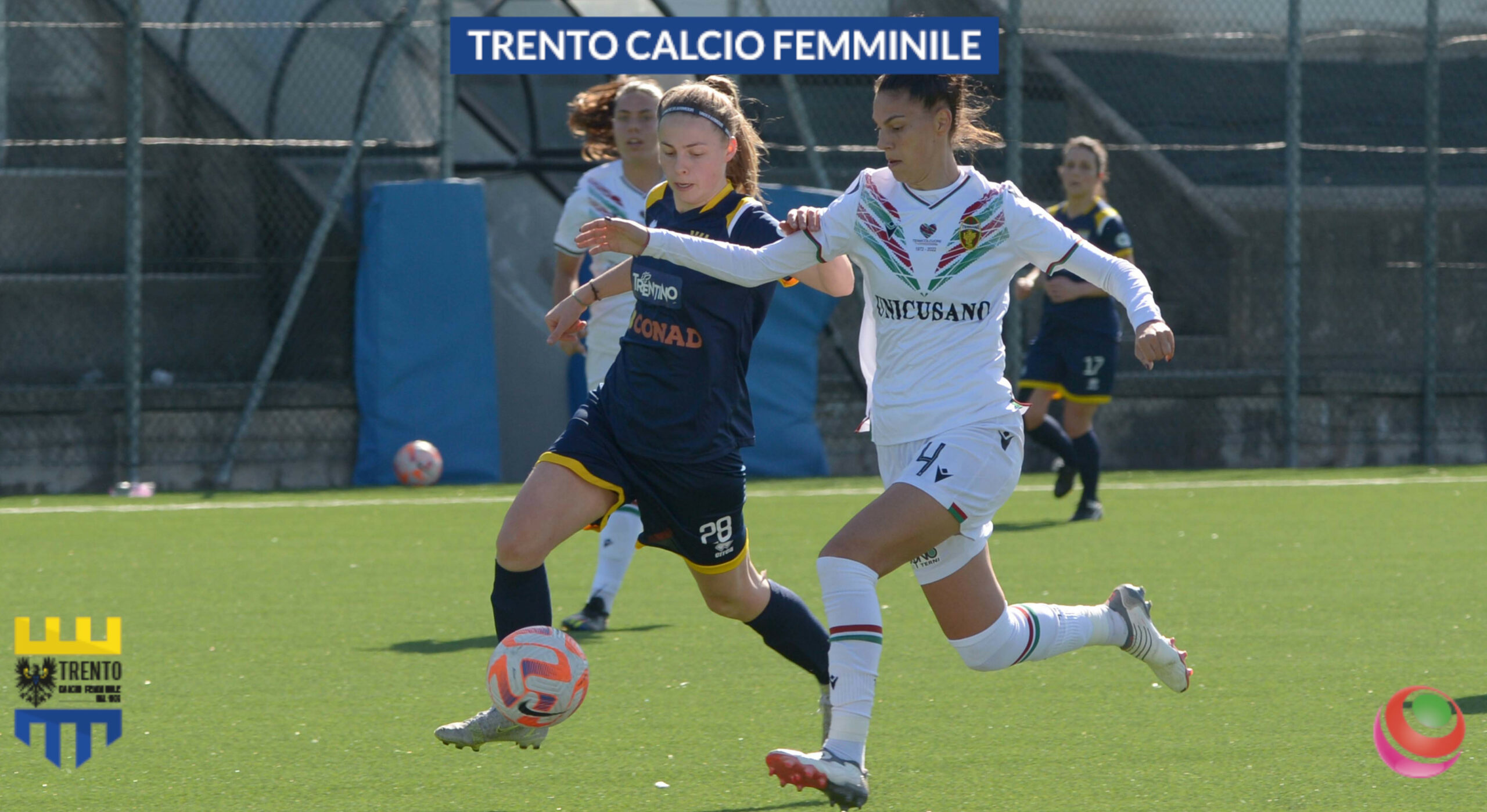 ll Trento Calcio Femminile, nella gara valida per la diciannovesima giornata del campionato di Serie B Femminile, perde per 1-6 la gara interna contro la Ternana, giocata, a causa della concomitanza con l’impegno casalingo dell’ A.C. Trento 1921, al Centro Sportivo “O. Ceschi” di Povo. Nella prima frazione di gioco le gialloblu giocano bene, tenendo testa ad un avversario forte e ben organizzato che riesce a sbloccare la partita dopo 27’ con un gran gol di Labate dalla distanza: a trovare il pari gialloblu è Giulia Rosa che al 42’ chiude una bella triangolazione in velocità, sull’asse Bielak-Tonelli, e trafigge Ghioc con un destro preciso e potente a fil di palo. Il secondo tempo si apre sul punteggio di 1-1 ma è la Ternana a cambiare marcia e a trovare al 52’ il gol del 2-1 con Spyridonidou che controlla in area e trafigge con un sinistro preciso Valzolgher dall’altezza del dischetto del rigore. Il Trento prova a reagire ma sono le ospiti a trovare il terzo gol dopo appena tre giri di lancette con Vigliucci che, servita in area da Spyridonidou, insacca con un sinistro preciso e potente. Per le aquilotte è notte fonda: dopo appena un minuto arriva il quarto gol delle rossoverdi con Labate che sfrutta un rinvio non preciso di Valzolgher e va alla conclusione da distanza ravvicinata trovando il gol che di fatto chiude la partita. A risultato ormai acquisito la Ternana dilaga e trova con Spyridonidou, al 63’ e al 71, il quinto e sesto gol. Il prossimo impegno per le aquilotte di Silvia Marcolin è in programma domenica 12 marzo alle ore 14:30 sul campo del Cittadella Women.