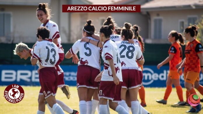 Il primo caldo stagionale crea un po’ di problemi ad entrambe le squadre in campo, anche se la partita inizia su ritmi alti da una parte e dall’altra. Primi minuti di studio tra le due formazioni fino al 19′ quando l’Arezzo passa in vantaggio grazie ad un gol di Razzolini che raccoglie un perfetto assist di Lulli e batte Italiano in uscita. Pochi minuti e le amaranto hanno un’altra occasione con capitan Verdi, ma la conclusione finisce alta. La Pistoiese si fa pericolosa su un calcio di punizione, mischia in area ma il direttore di gara ferma tutto per carica sul portiere. Nella ripresa il livello del pressing amaranto si alza e al 54′ Ceccarelli di testa firma il raddoppio su corner battuto da Tuteri. Passano quattro minuti e l’arbitro concede un calcio di rigore per un fallo di mano nell’area di rigore della Pistoiese. Sul dischetto si presenta Orlandi che batte Italiano e porta il punteggio sul 3-0. La Pistoiese approfitta di una leggerezza della retroguardia amaranto, ma è brava Valgimigli a rimediare. Al 76′ l’Arezzo chiude definitivamente il match grazie al secondo gol di giornata di Ceccarelli che spiazza Italiano dal dischetto concesso per fallo su Gnisci. Con questa vittoria le amaranto restano agganciate alla coppia di testa formata da Bologna e Filecchio.