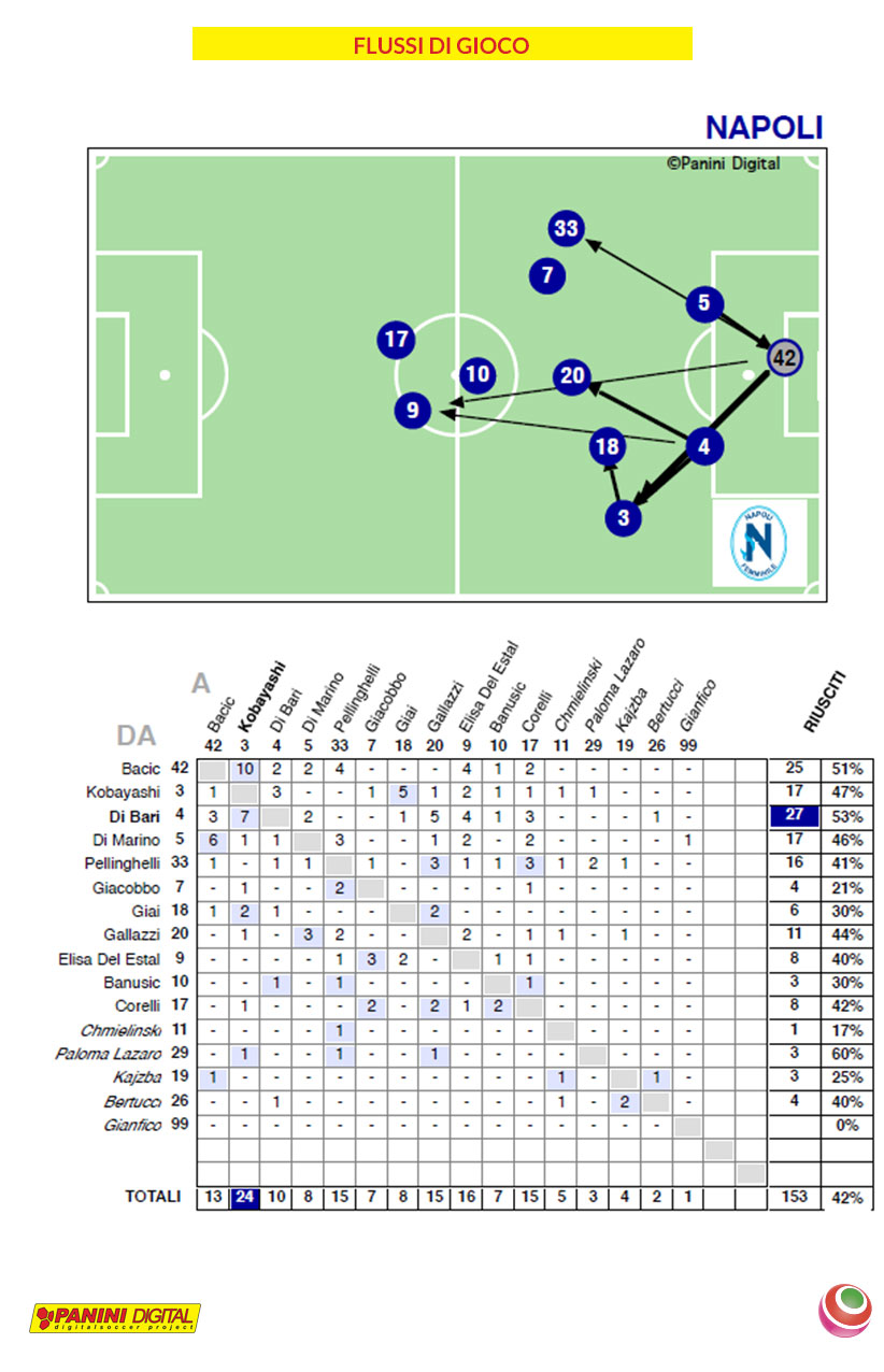 Per quanto riguarda la squadra partenopea, esse hanno usato la sfera 363 volte (35%), e se la sono passata 153 volte (25%): è Martina Di Bari quella che ha fatto di più; infatti, ha passato 27 volte il pallone, di cui 10 sono stati dati a Miharu Kobayashi, la quale ha anche ricevuto 24 volte la palla, 10 sono di Doris Bačić.