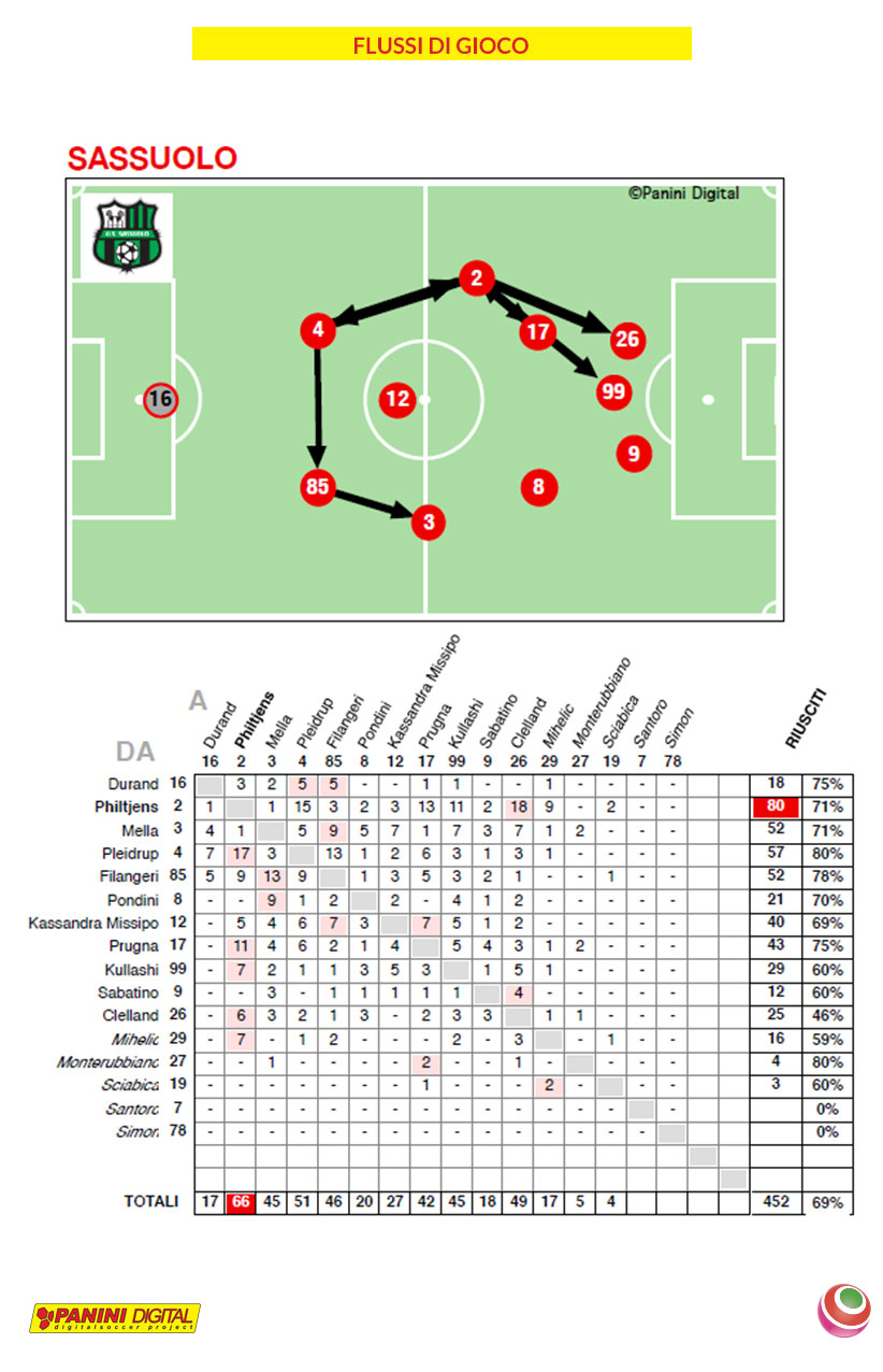 A livello difensivo il Napoli è avanti nella percentuale sulle palle recuperate temporanee (39,5%-21,9%), e in quelle giocate in zona area dagli avversari (110-28), mentre il Sassuolo è avanti sulle palle recuperate effettive (54,2%-46,2%), su fine azione avversaria (24%-14,4%) e nella protezione area (52,5%-44,4%).