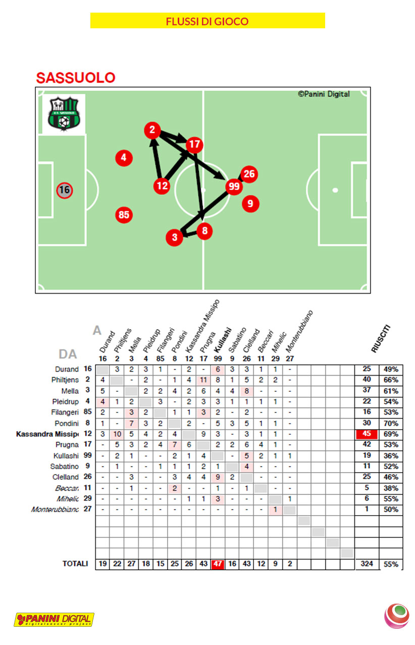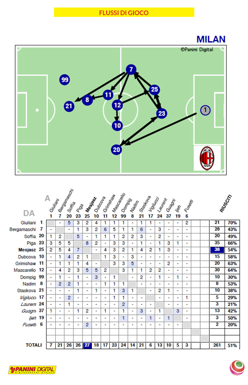 Vediamo il flusso di gioco di Sassuolo e Milan. Partiamo dalle neroverdi che hanno giocato 594 volte il pallone (53%), mentre ha effettuato 324 passaggi riusciti (55%): a fare più passaggi è stata Kassandra Missipo che ha servito 45 palloni, e 10 li ha consegnati a Davina Philtjens; invece, Loreta Kullashi ha visto ricevere 47 palloni, di questi 9 sono arrivate da Lana Clelland.